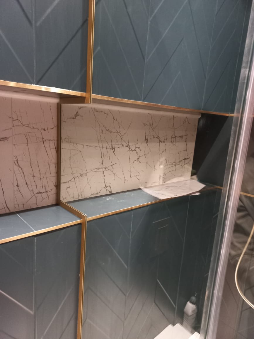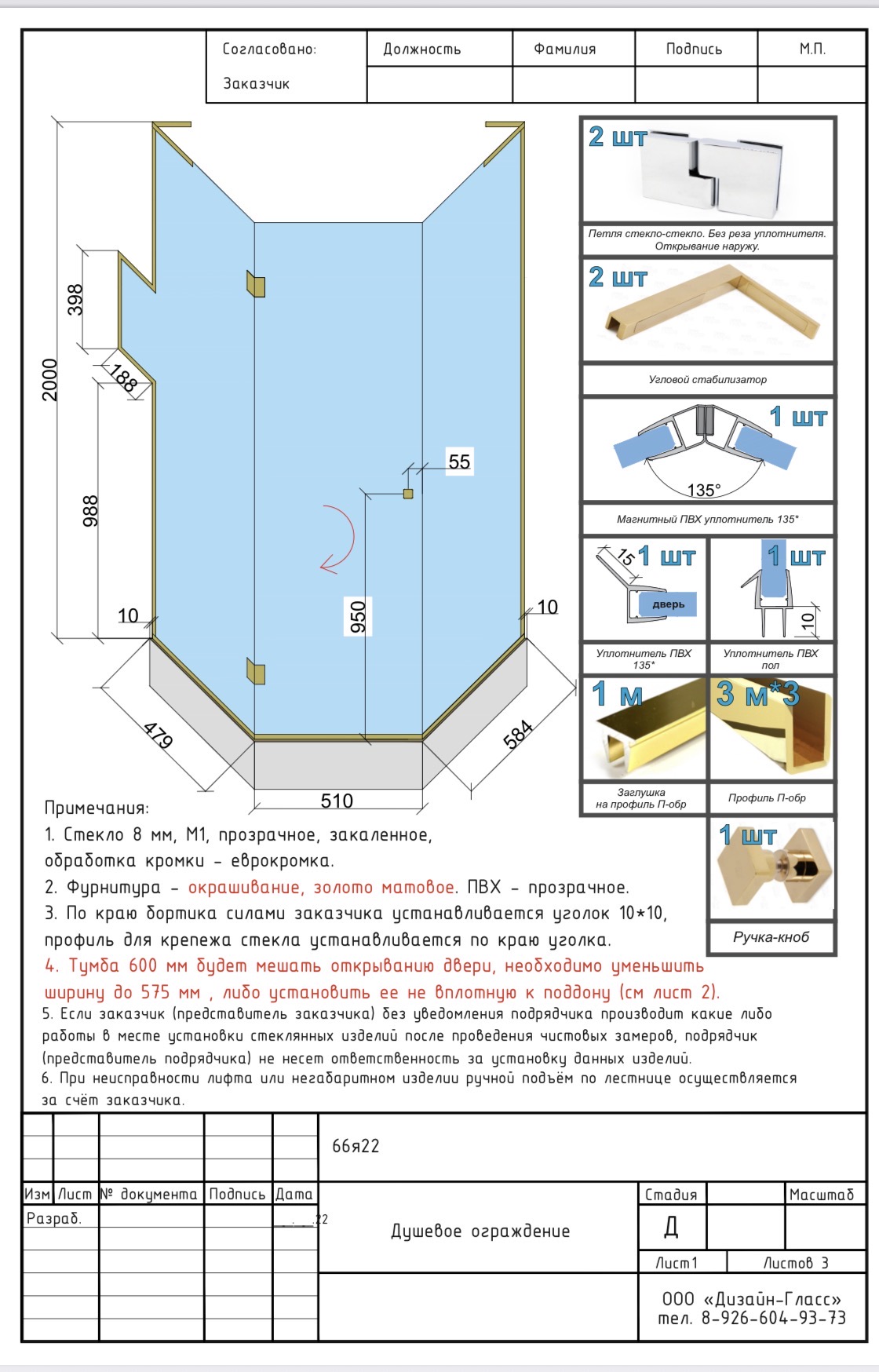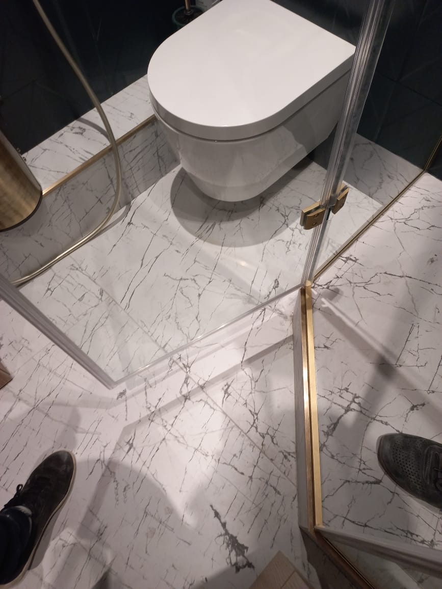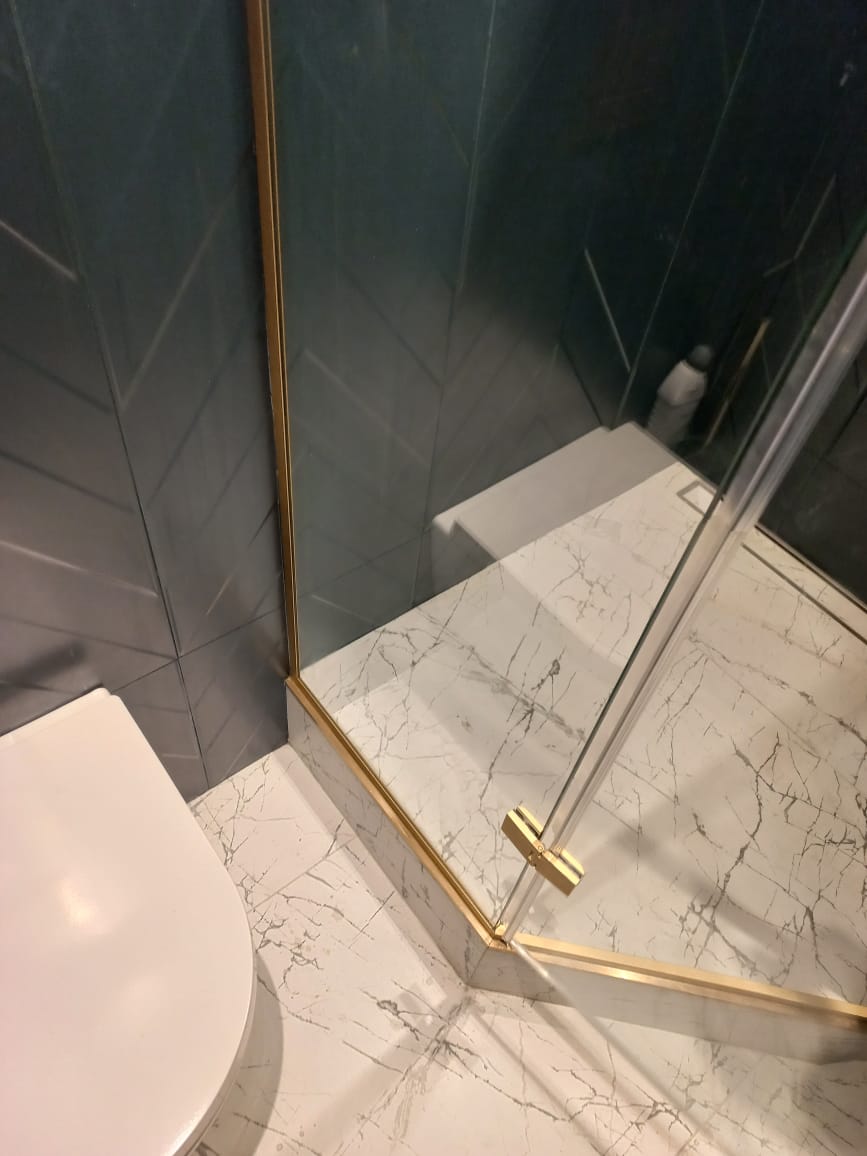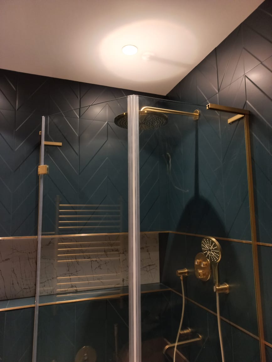 В данном проекте душевая выполнена из хвалебного стекла в золотой фурнитуре.