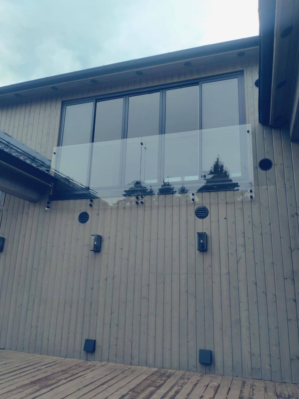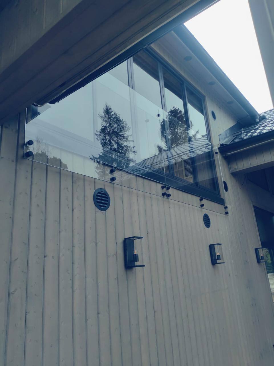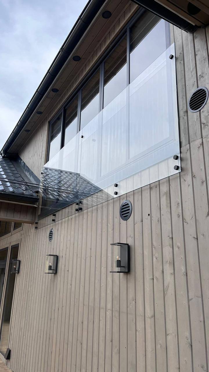 В данном проекте использовано закаленное стекло 10мм с креплением на специальные точечные крепления.