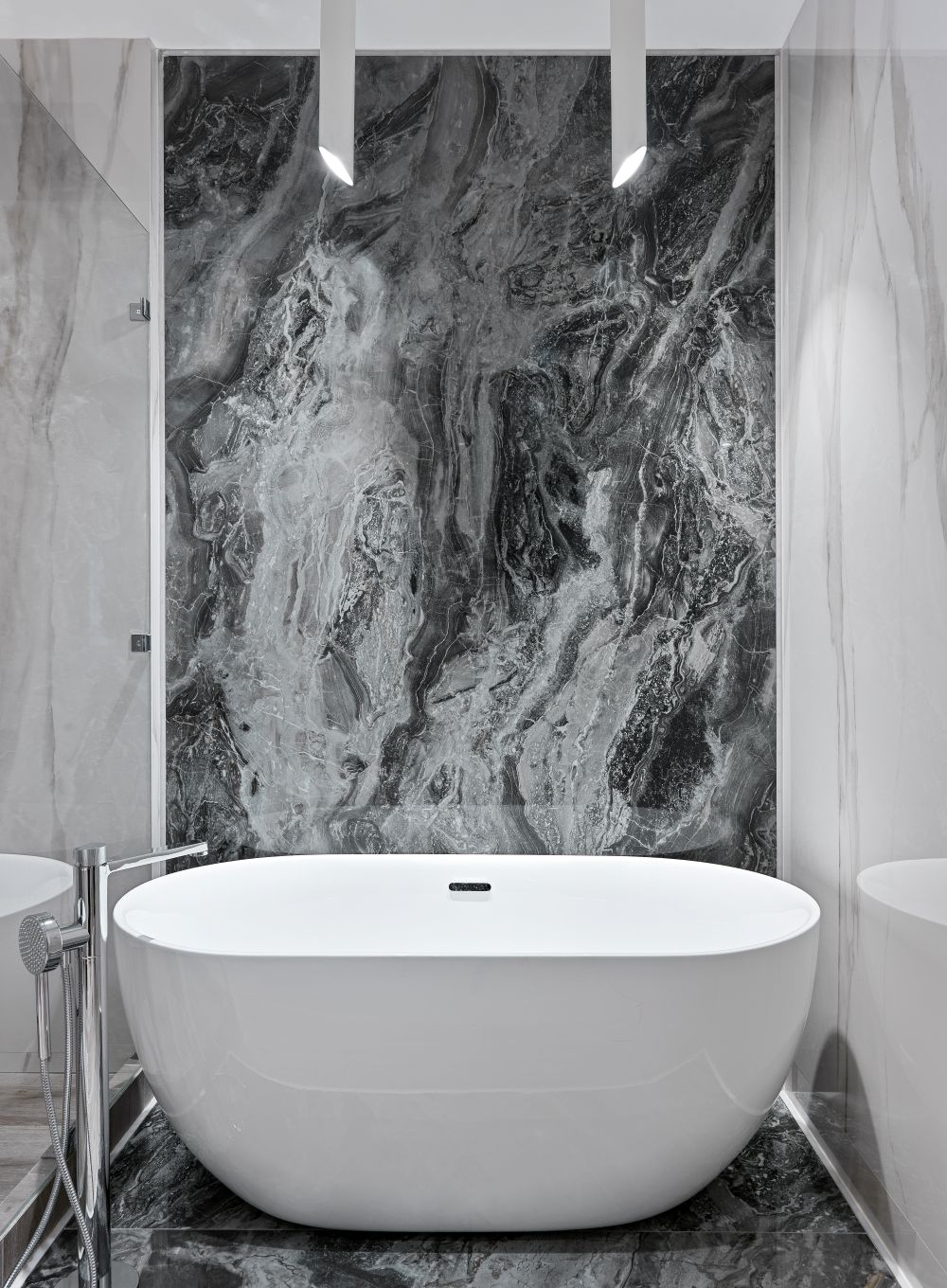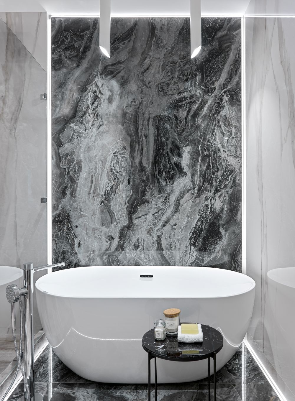 - Единство материала: Панно на стене и пол выполнены из итальянского натурального камня, создавая эффект цельного пространства.