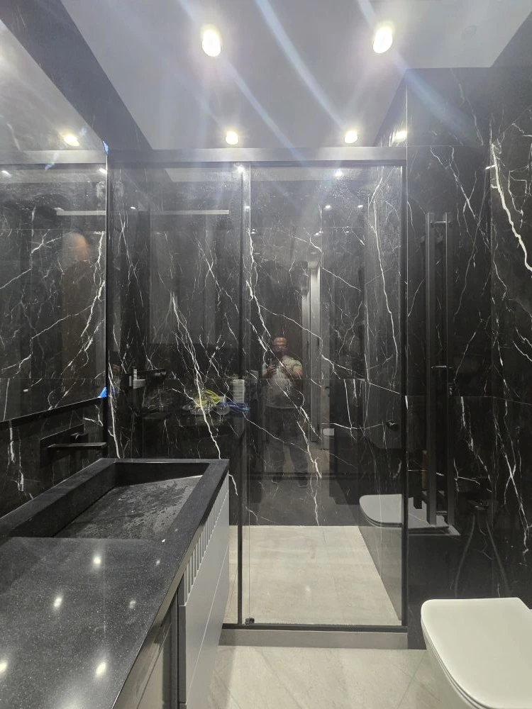 Этот проект — идеальный баланс брутальной эстетики и комфорта. Черный мрамор с контрастными венами задает ритм, а продуманные детали делают пространство функциональным.