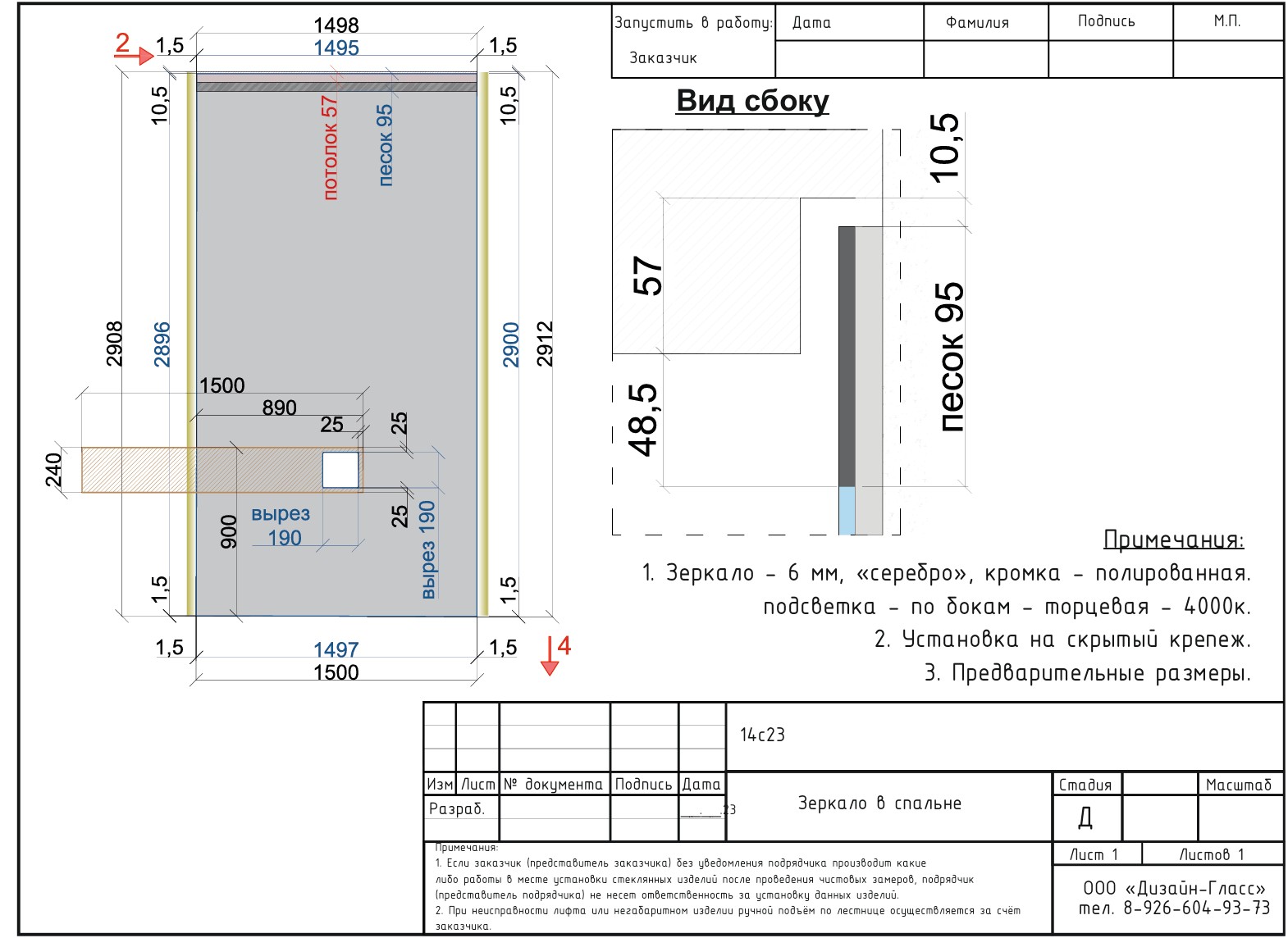 Главной задачей стала установка цельного зеркального полотна высотой 2912 мм и шириной 1500 мм. Работа с такими габаритами требует соблюдения жестких допусков, особенно при использовании скрытого крепежа и организации внутреннего светового контура.