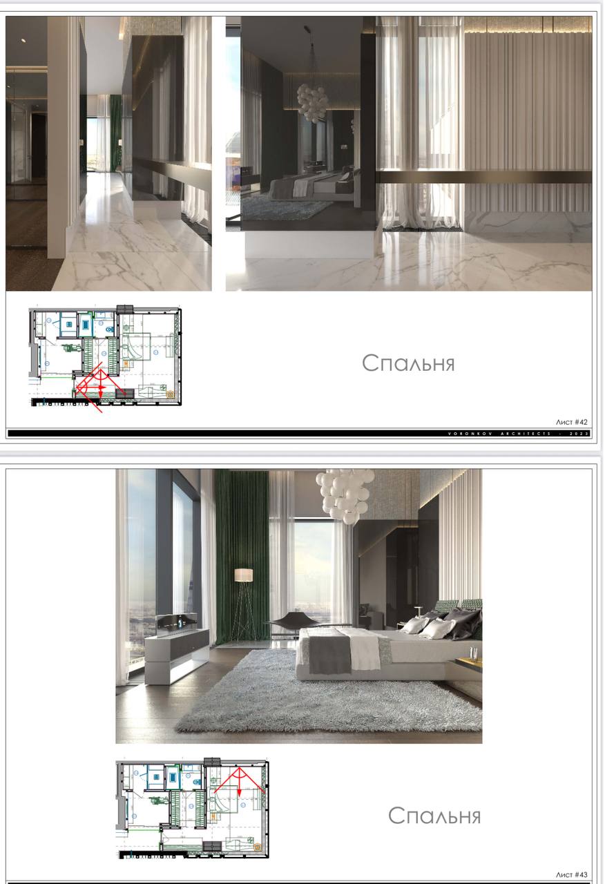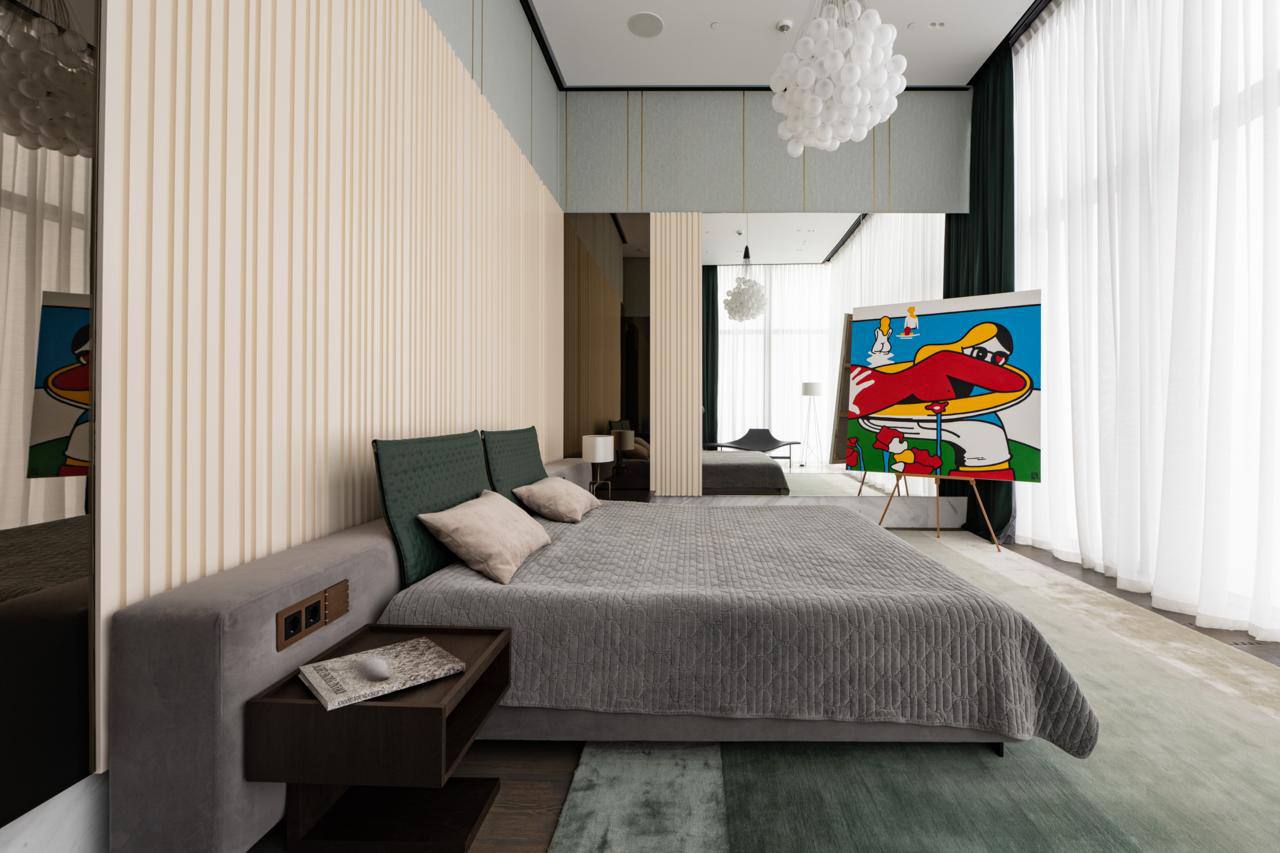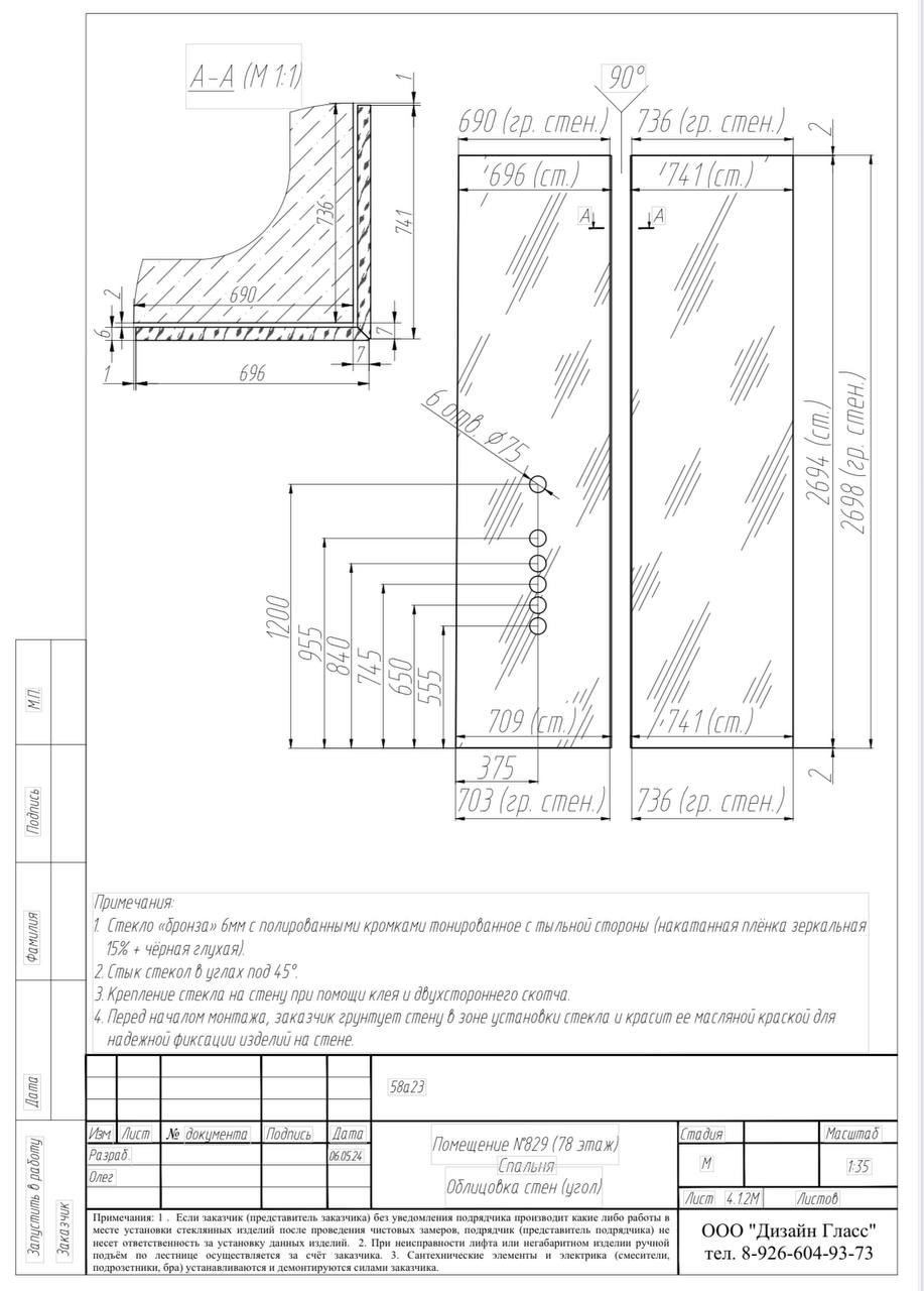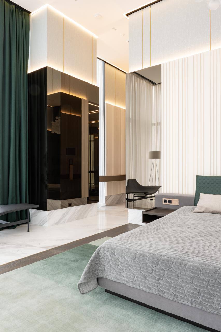 Зеркала для колонны выполнены в цвете «бронза». Изделия на колонну выполнены с внутренней полировкой и идеально сложены в единую конструкцию. Бронзированные зеркала на угол комнаты изготовлены с внутренним фацетом и отверстиями для блока выключателей умного дома. Зеркала в спальне смонтированы в одной плоскости с декоративными панелями. Все изделия для спальни и коридора установлены на скрытый крепеж.