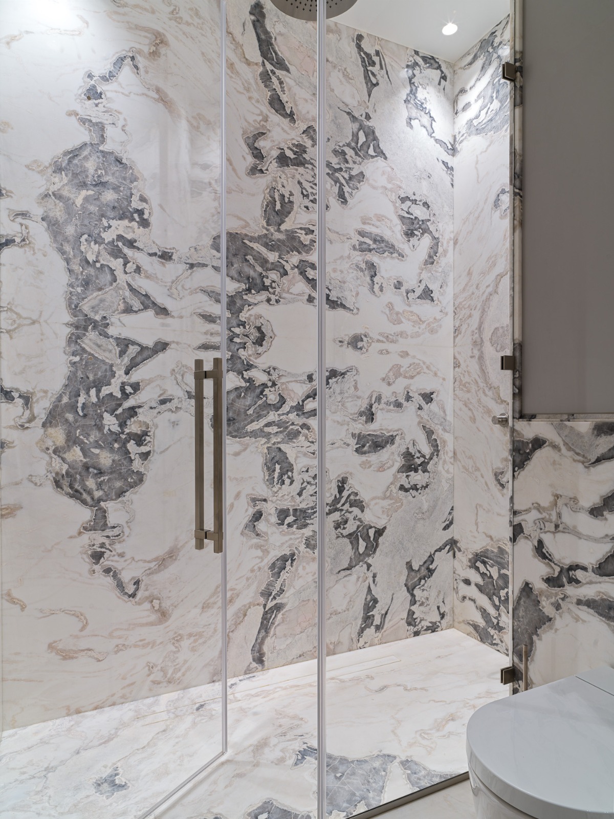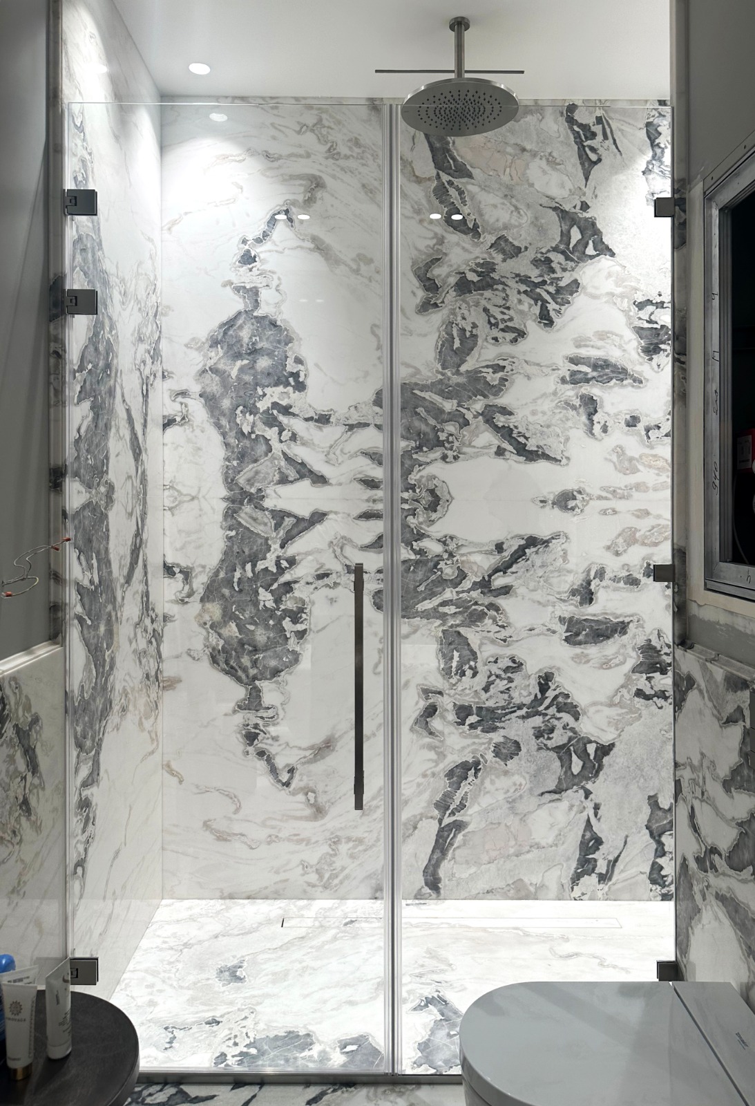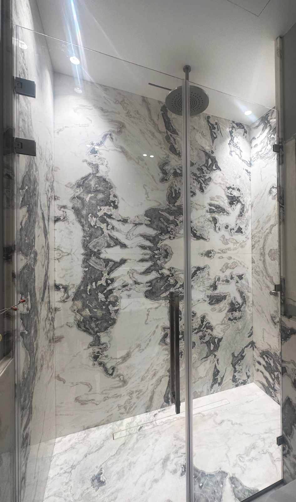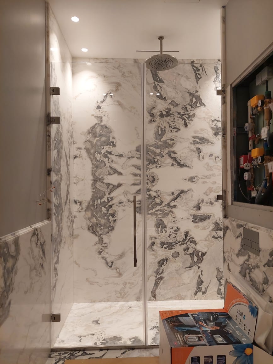 Конфигурация дверей в подобной душевой может быть как распашной, так и раздвижной в зависимости от пожеланий заказчика.