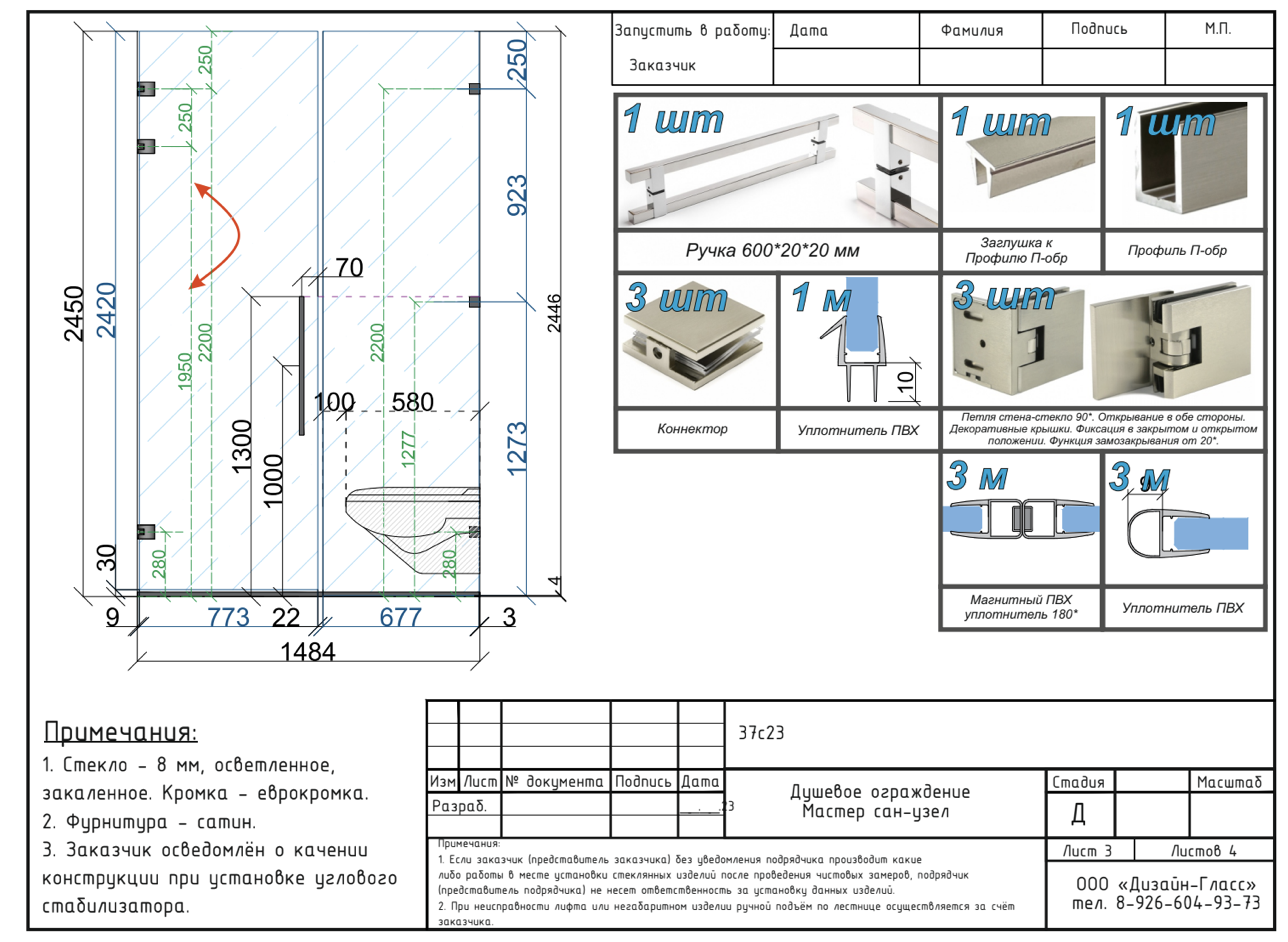 В данном проекте выполнена душевая перегородка с распашной дверью.