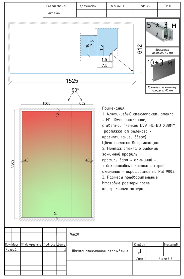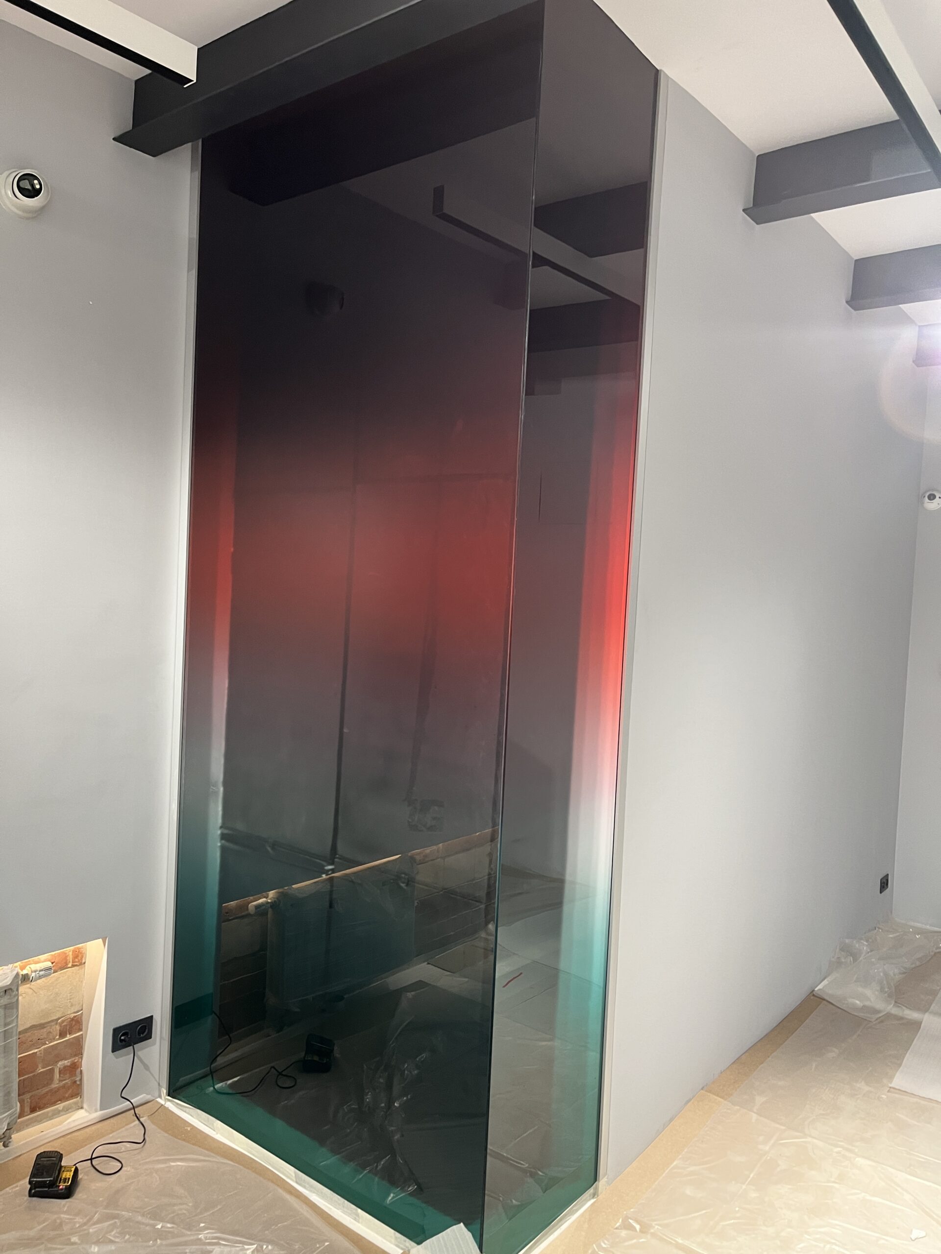 В проекте использовано закаленное стекло 10мм, с цветной пленкой EVA HC-BD 0.38MM, растяжка от зеленого к красному (снизу вверх).