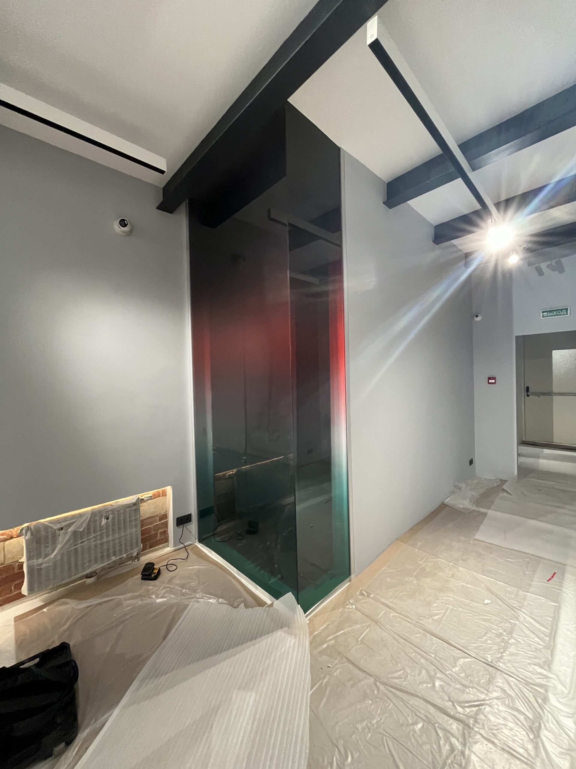 По заданию бюро Марианны Петренко изготовлена декоративная конструкция из стекла с градиентной окраской, переходящей от красного к зеленому. Данная перегородка выполняет декоративную функцию, закрывая коммуникации.