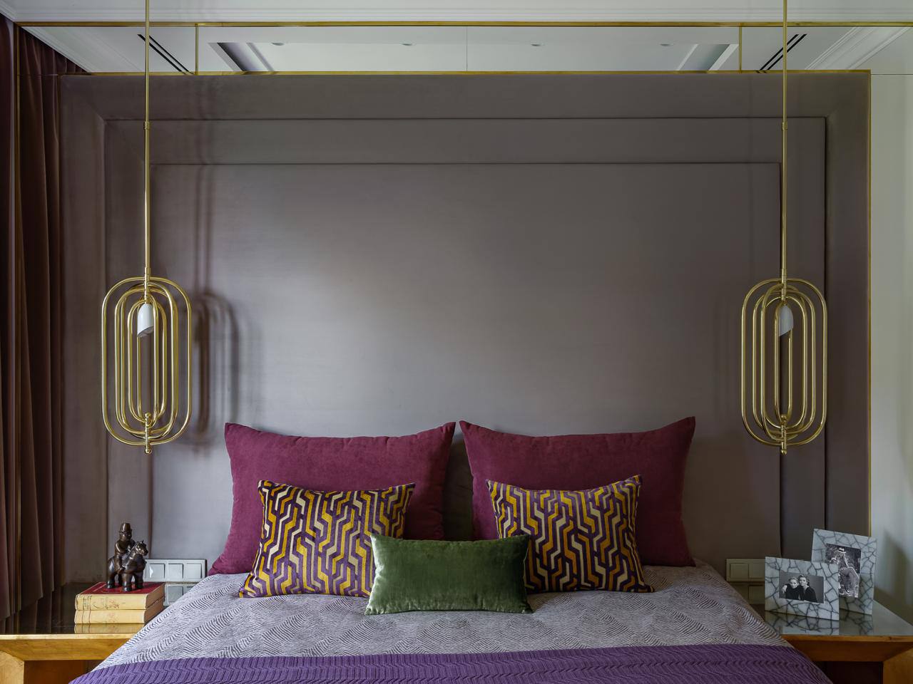 Изысканное зеркальное панно сочетает в себе элегантность и современный стиль, создавая уникальный акцент в интерьере. Обрамляющая зеркальное панно мягкая панель выполнена из приятной на ощупь ткани, что добавляет теплоту и уют в спальную зону. Элементы из латуни, используемые в конструкции, придают панно роскошный вид и обеспечивают надежность. Латунные акценты добавляют изысканности и подчеркивают современный стиль.