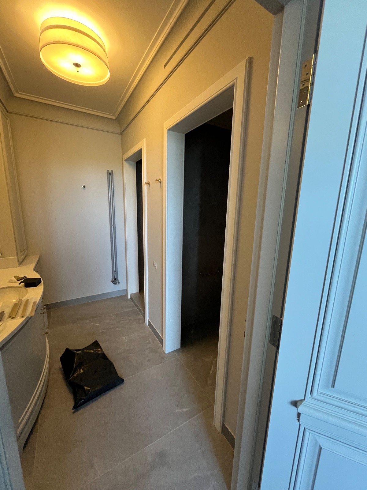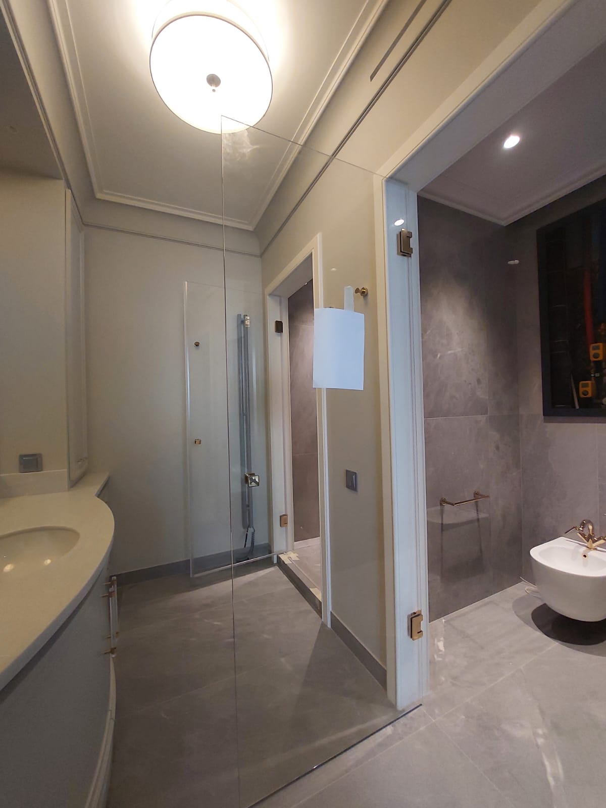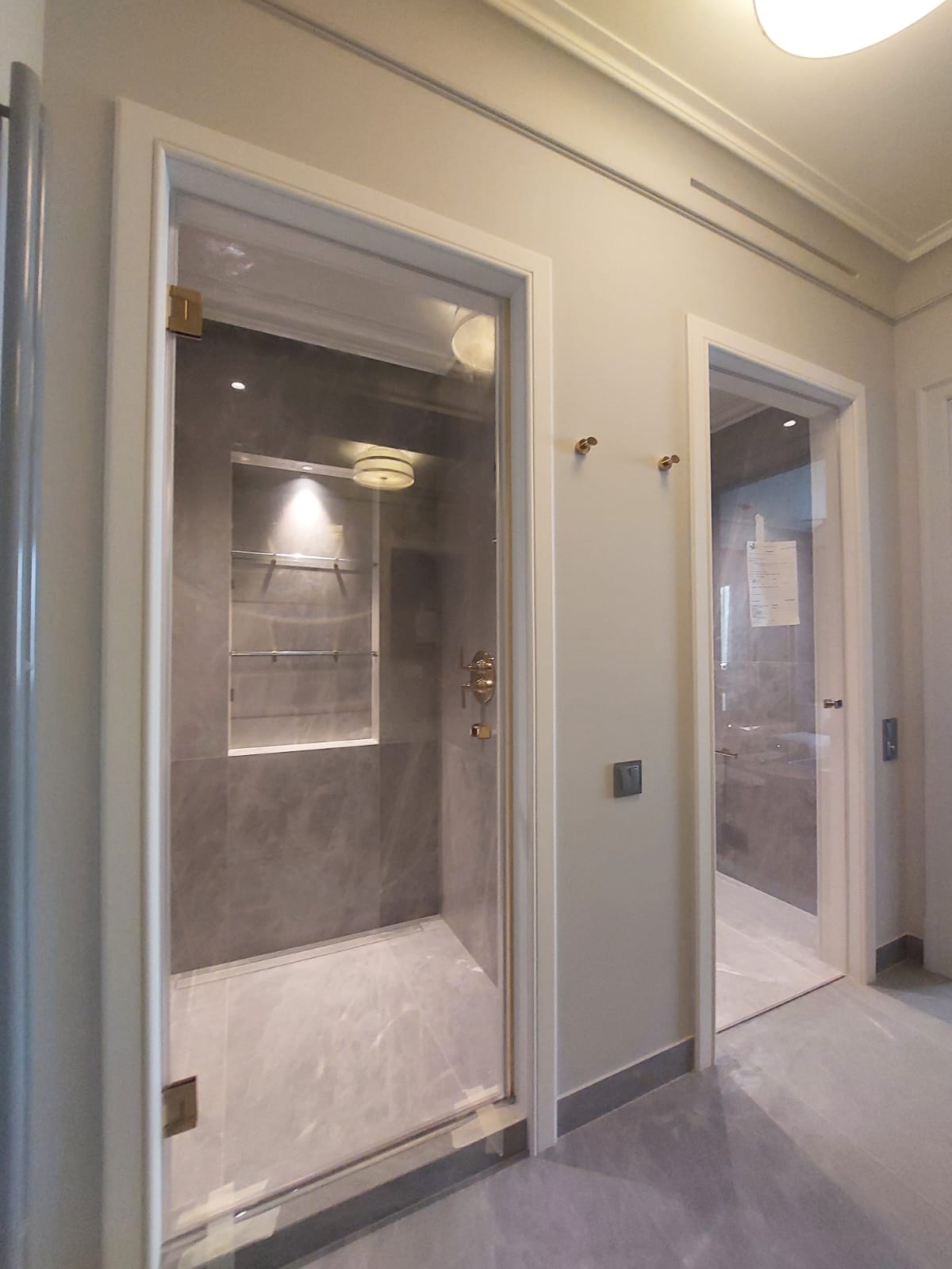 Стеклянные двери — про чистую геометрию и спокойную роскошь. Прозрачные полотна из закалённого стекла впускают свет, визуально расширяют санузлы, а белые наличники аккуратно «вшивают» проёмы в архитектуру стен. Тёплая фурнитура в золотом цвете добавляет интерьеру благородный блеск и делает интерьер живым.