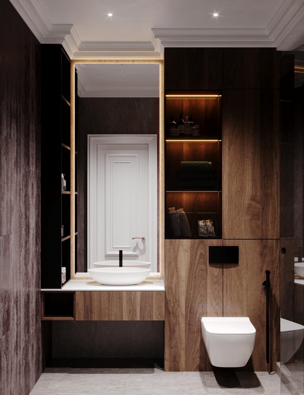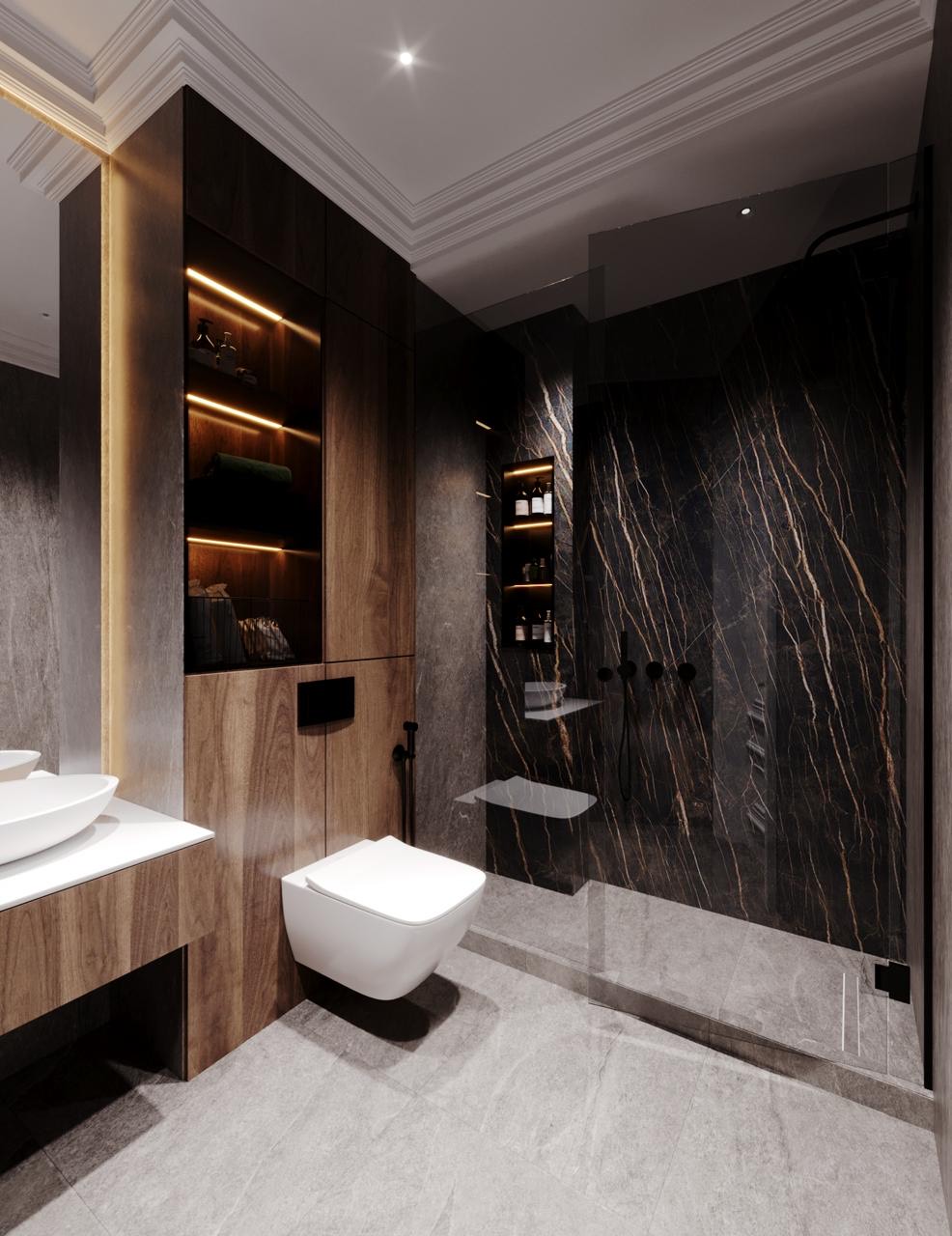 Светлая, лаконичная ванная с акцентом на прозрачность и отражение. Стеклянные перегородки визуально расширяют пространство, а зеркало с подсветкой делает интерьер «легким».