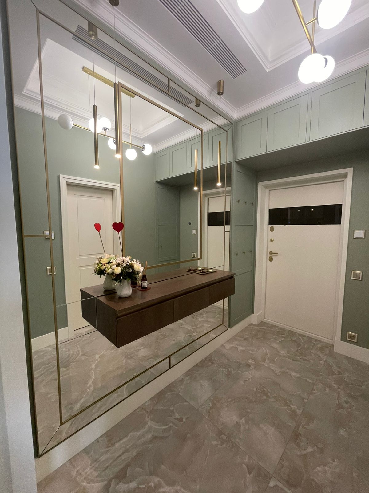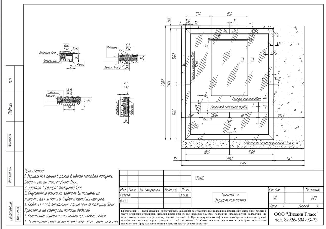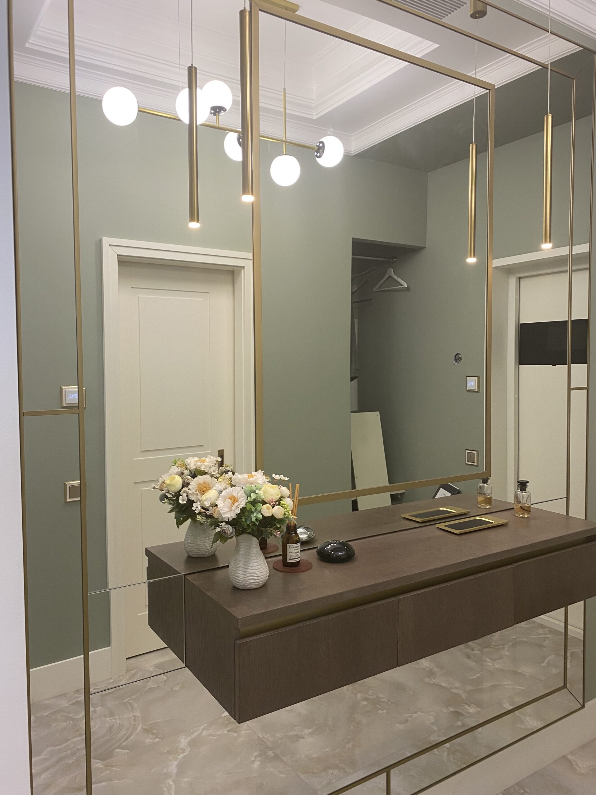 В данном проекте использовано зеркальное полотно толщиной 4мм, рамки в цвете «матовая латунь».