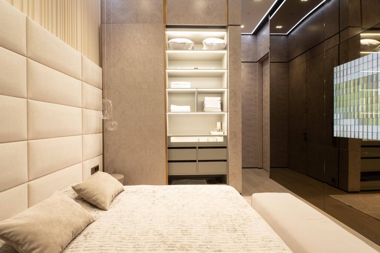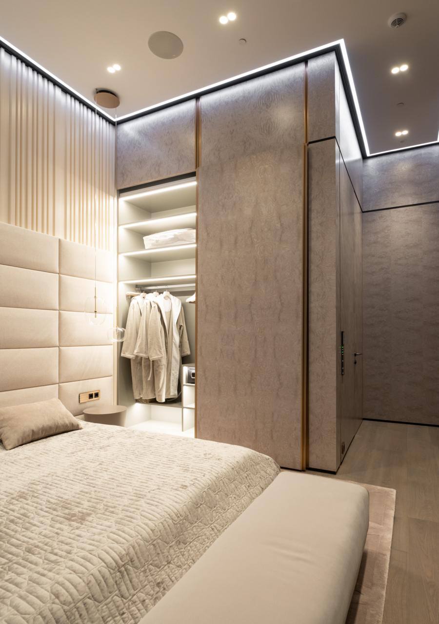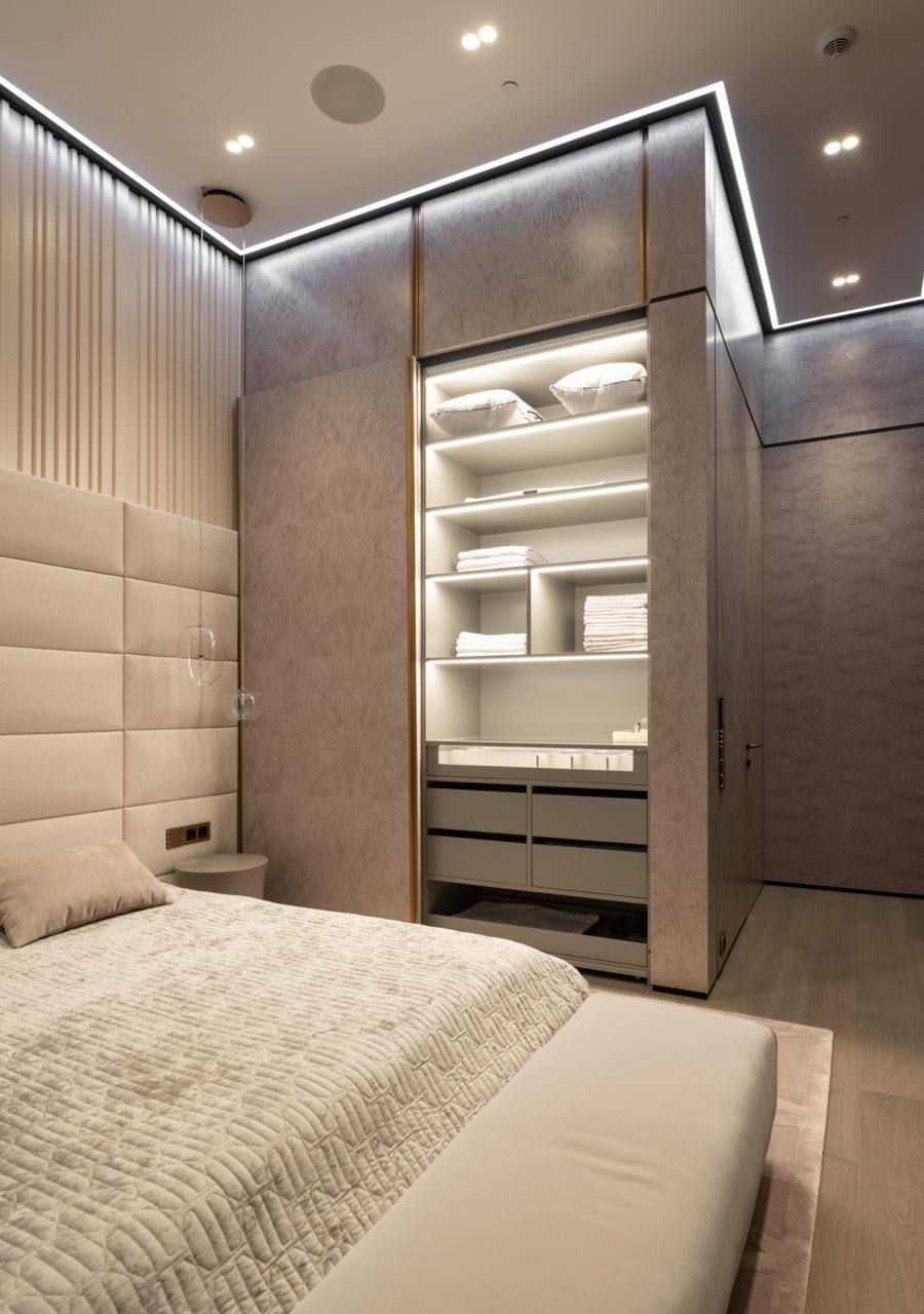 Рады представить Вашему вниманию шкаф с раздвижной системой открывания дверей в спальню. В проекте исполнена компланарная система открывания. Фасады шкафа выполнены в шпоне (Италия), который набирался мастером на производстве. Раскладка предварительно согласовывалась с архитектором объекта Воронковым Кириллом.