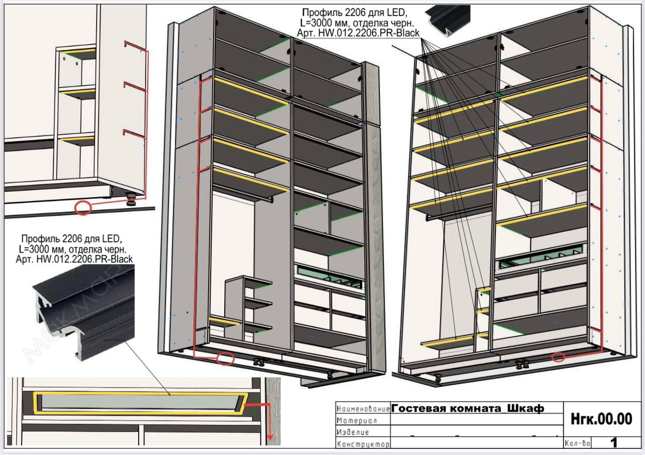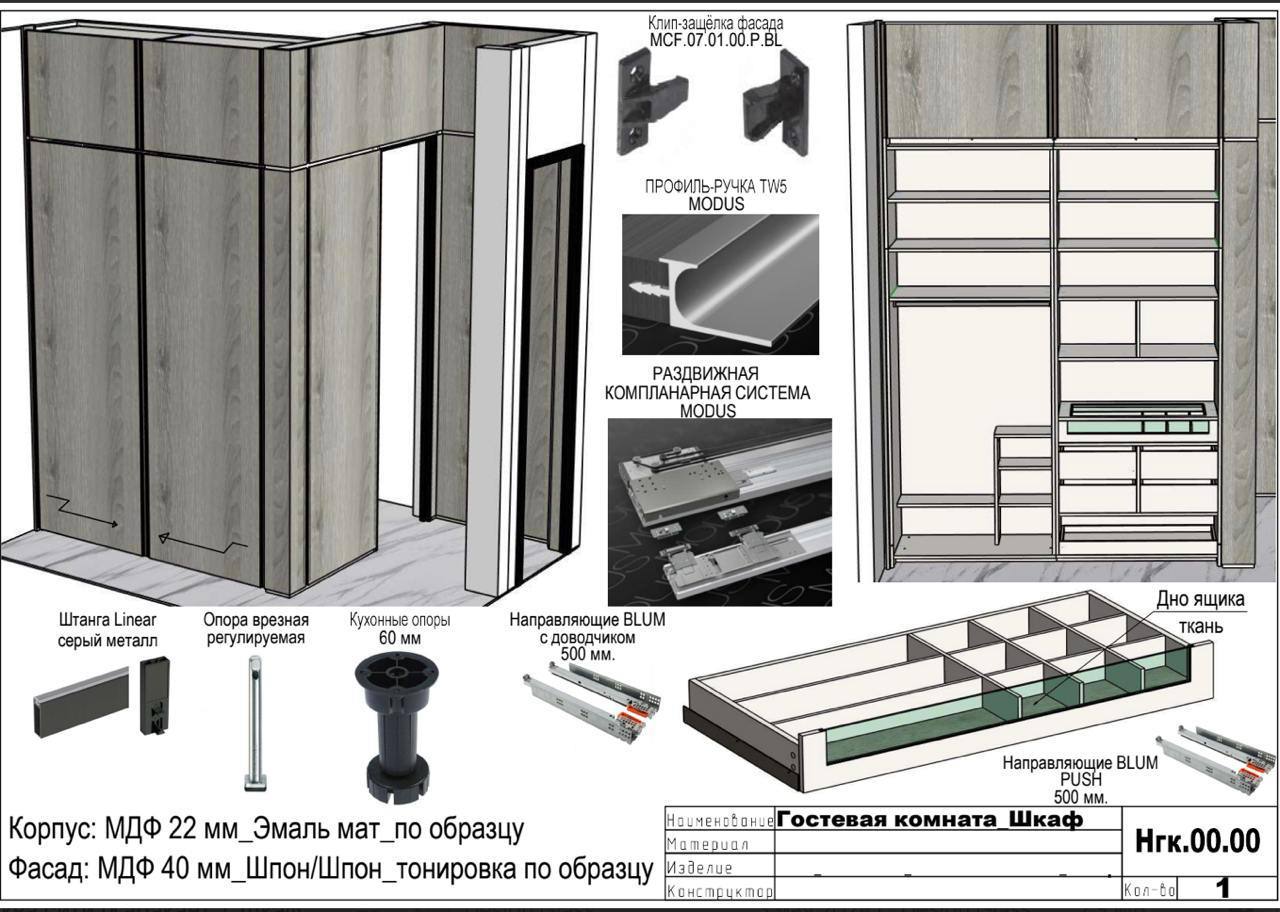 Внутреннее наполнение включает штанги для одежды, полки для сложенных вещей и выдвижные коробки. Заказать мебельный набор можно в нестандартных размерах.