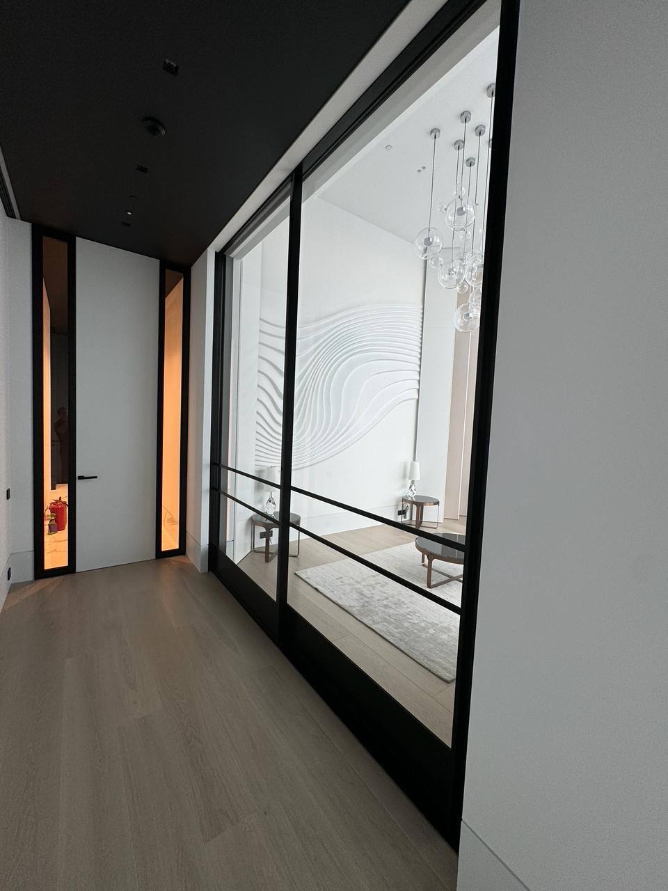 Стеклянные вставки в двери и перегородки являются универсальным решением для создания не только стильного, но и функционального пространства. Они позволяют зонировать помещения без эффекта замкнутости, максимизировать свет и сохранять визуальную прозрачность. В данном проекте использовано закаленное стекло 40мм, конструкция является несущей.