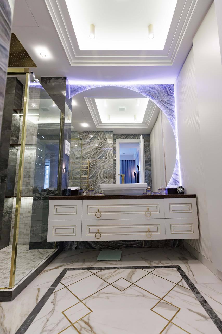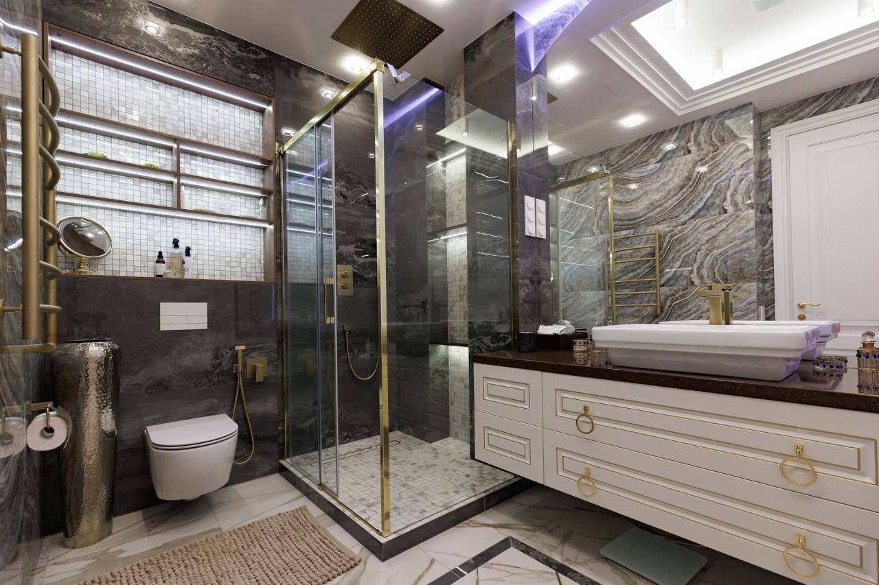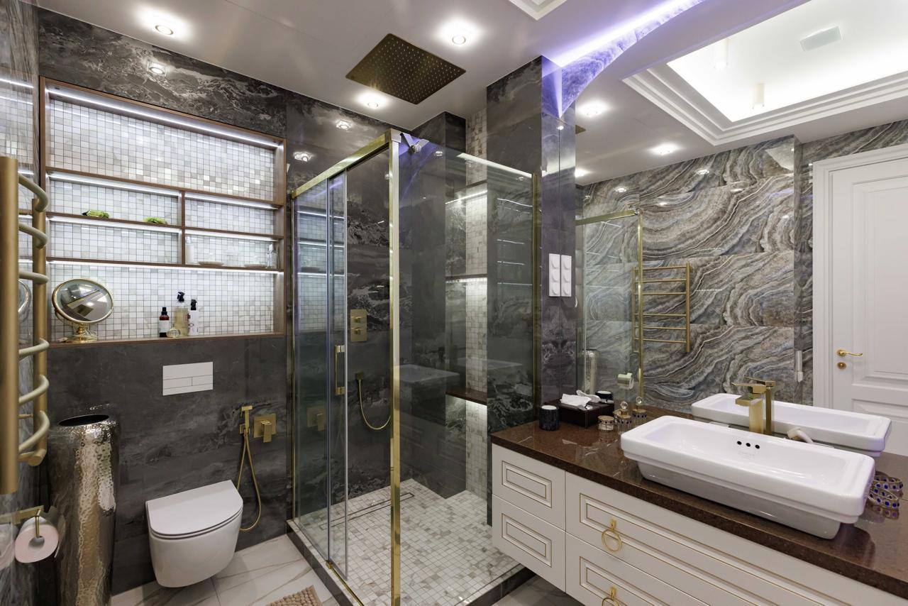 На полу и стенах использован натуральный камень, который добавляет изысканности и идеально подходит для ванной.